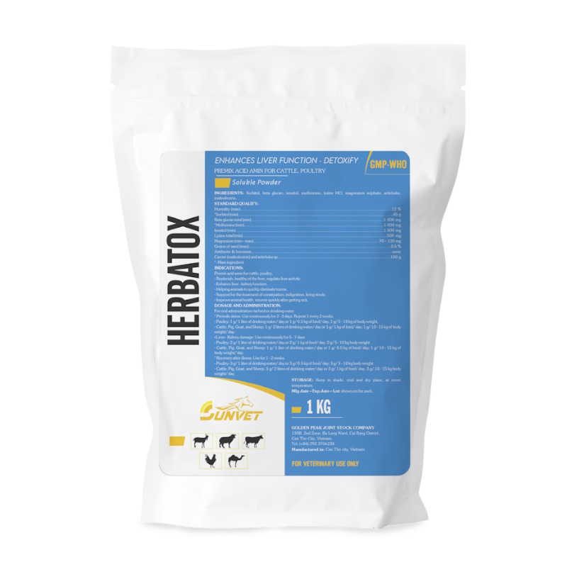 – Cattle, Pig, Goat, and Sheep: 1 g/ 1 liter of drinking water/ day or 1 g/ 0.5 kg of feed/ day; 1 g/ 10 – 15 kg of body weight/ day.